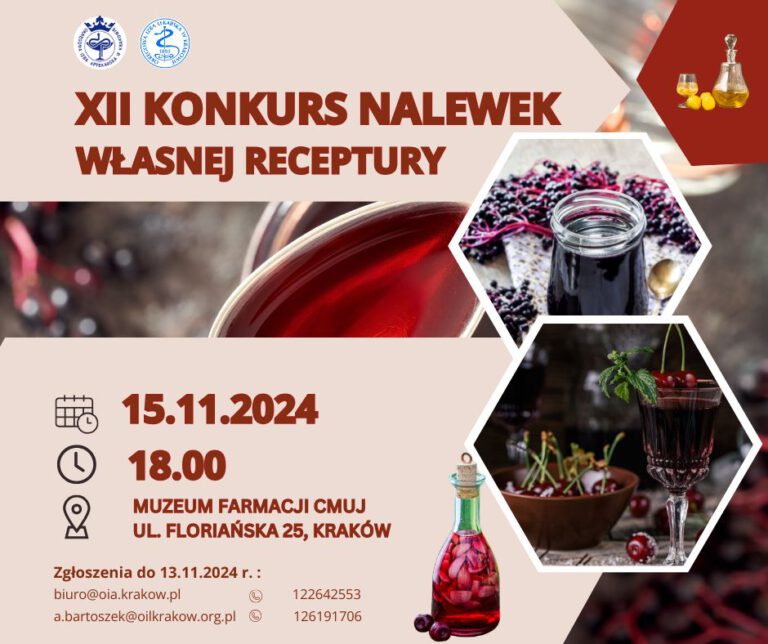 Serdecznie zapraszamy do udziału w konkursie. Ze względów organizacyjnych ilość miejsc będzie limitowana do 60 osób, więc osoba wystawiająca przynajmniej dwie różne nalewki będzie mogła zabrać ze sobą dwie towarzyszące Jej osoby. Musimy zachować proporcje pomiędzy ilością nalewek do degustacji a ilością degustujących. Zgłoszenia udziału należy kierować do OIA lub OIL w Krakowie. Szczegółowe dane w regulaminie. Wstęp wolny, ale przy wejściu będzie obowiązywała lista osób zgłoszonych . Regulamin konkursu i druk zgłoszenia do konkursu w załącznikach poniżej.