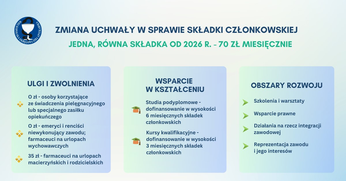 Mając na uwadze powyższe, a także ogólne zasady stosowane w innych zawodach zaufania publicznego, a przede wszystkim w zdecydowanej większości okręgowych izb aptekarskich, Wielkopolska Okręgowa Rada Aptekarska podjęła decyzję o wdrożeniu drugiego i docelowego etapu zrównania składek członkowskich w Wlkp. OIA. Od 2026 r. obowiązywać będzie jedna, równa składka podstawowa w wysokości 70 zł miesięcznie, niezależnie od miejsca i formy wykonywania zawodu. Zrównanie składki jest również zgodne zarówno z rekomendacją wynikającą z uchwały VII Krajowego Zjazdu Aptekarzy z dnia 31 stycznia 2016 r., jak i orzecznictwem sądowym w tym zakresie.