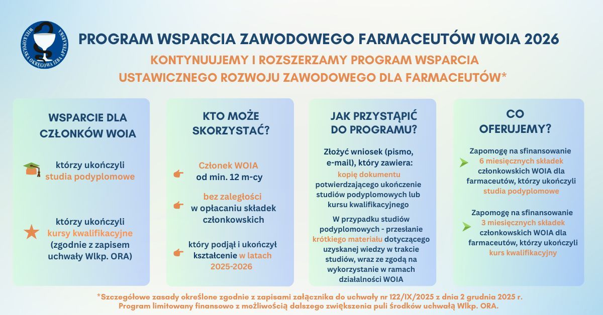 Realizując naszą misję i Państwa prawa w zakresie pomocy w rozwoju zawodowym farmaceutów, Wielkopolska Okręgowa Rada Aptekarska podjęła decyzję o kontynuowaniu i rozszerzeniu zakresu programu wsparcia ustawicznego rozwoju zawodowego naszych farmaceutów. W 2026 r. pragniemy utrzymać identyczne jak w 2025 r. działania wspierające farmaceutów ponoszących trud kształcenia w systemie studiów podyplomowych oraz dodać wsparcie dla farmaceutów podnoszących swoje kwalifikacje w systemie kursów kwalifikacyjnych.