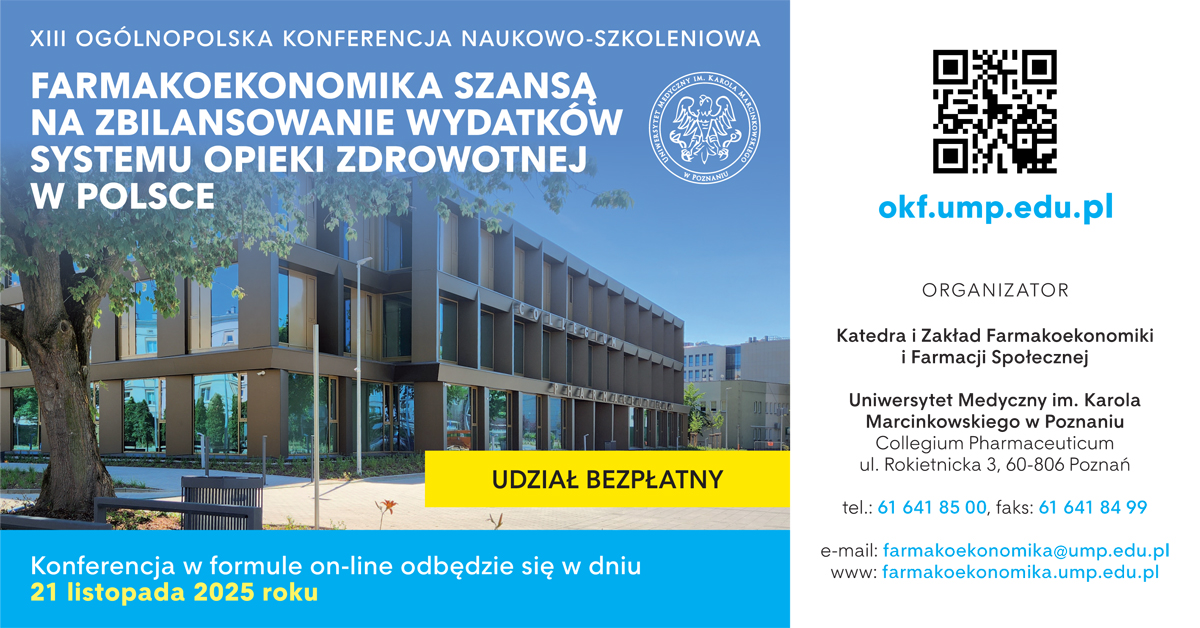 Mamy zaszczyt zaprosić Państwa do udziału w XIII Ogólnopolskiej Konferencji Naukowo-Szkoleniowej „Farmakoekonomika szansą na zbilansowanie wydatków systemu opieki zdrowotnej w Polsce”. Wydarzenie odbędzie się 21 listopada 2025 r. (piątek) w formie on-line.